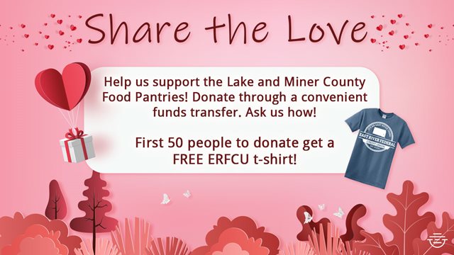 Share the love with our communities by making a donation at our drive-up or over the phone to the Lake and Miner County Food Pantries. You can donate easily through a funds transfer, just ask us how. Plus, the first 50 people to donate get a FREE ERFCU shirt! Donations will be taken until Saturday, February 20.