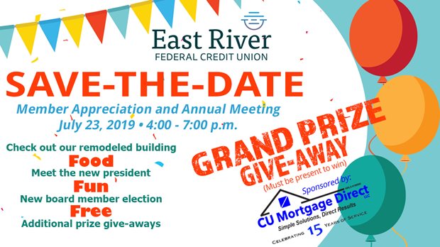 East River Federal Credit Union invites you to our member appreciation event on Tuesday, July 23rd from 4-7 p.m. Our annual meeting will be held, in conjunction with this event and tours of the newly remodeled building will also take place. The brief annual meeting will be held at 5:45 p.m. in the Credit Union and will include an election for a three-year term position on the East River FCU Board of Directors.