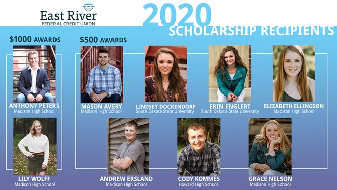 $500 scholarship winners: Mason Avery, Madison High School; Lindsey Dockendorf, South Dakota State University; Erin Englert, South Dakota State University; Elizabeth Ellingson, Madison High School; Andrew Ersland, Madison High School; Cody Kommes, Howard High School; and Grace Nelson, Madison High School