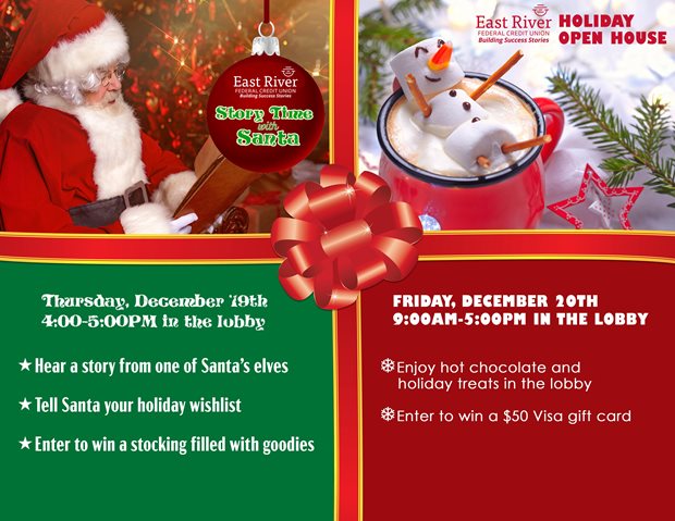 Mark your calendar for Storytime with Santa on December 19th at East River Federal Credit Union, starting at 4:00 p.m. Kids will hear a story from one of Santa's elves and visit with the big man himself! Then, on Friday, make plans to stop by our Holiday Open House for refreshments and a door prize drawing as we celebrate the season with our members and the community!