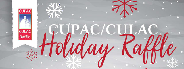 The annual CUPAC/CULAC Holiday Raffle will be held on Thursday, December 10 for $5000 in prizes including a $1000 cash grand prize. Additional prizes include five $500 VISA gift cards, five $200 VISA gift cards, and five $100 VISA gift cards. Suggested contribution is $5 for 1 ticket and $20 for 5 tickets.