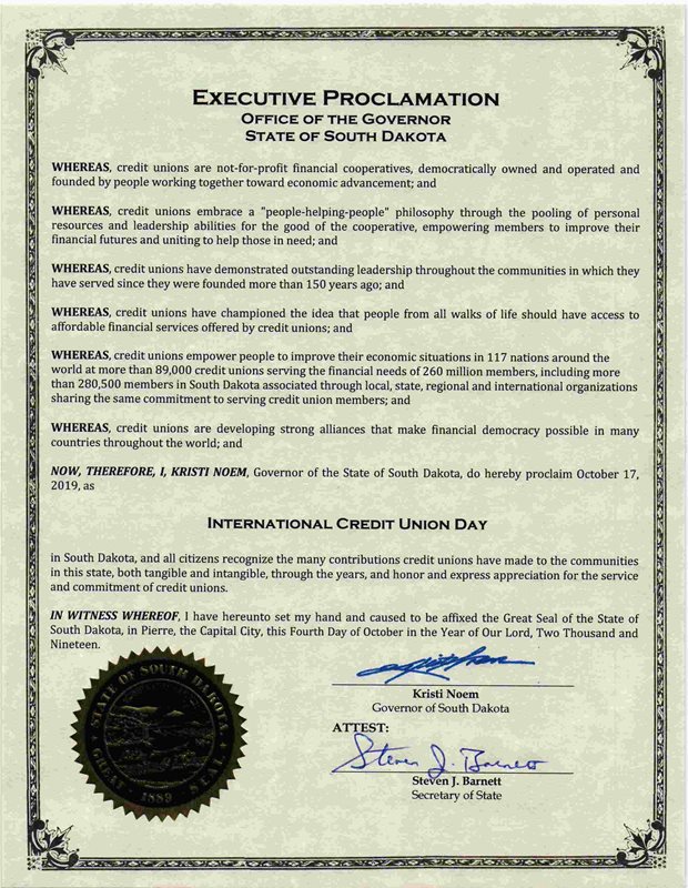 South Dakota Governor Kristi Noem has proclaimed Thursday, October 17th as Credit Union Day in South Dakota. On this day, credit unions worldwide will come together to celebrate International Credit Union Day (ICU Day) and the role that financial cooperatives play in improving the lives of their members.